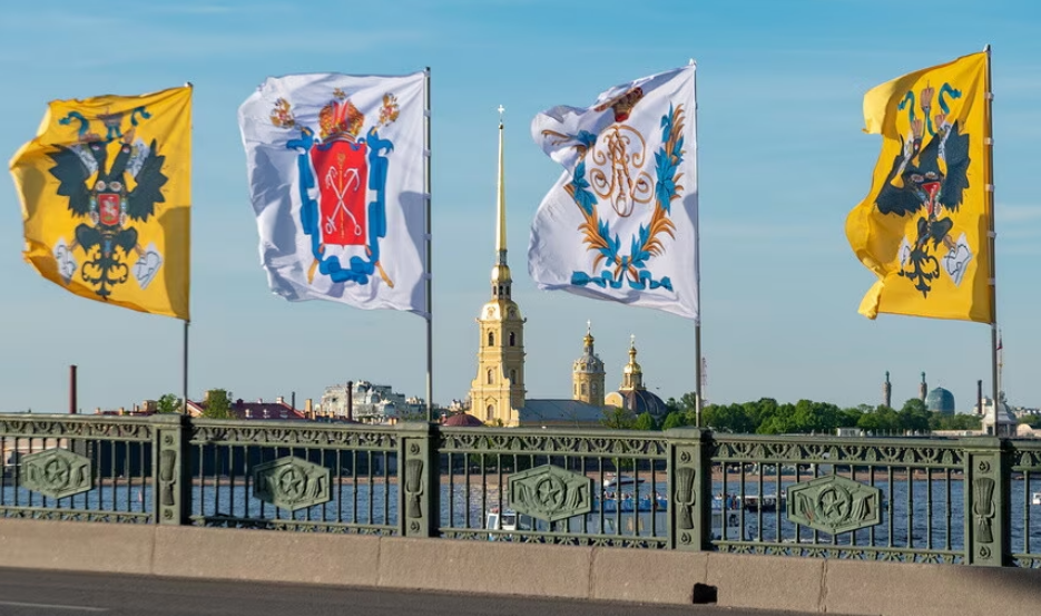 Санкт-Петербург украсили флаги и гирлянды, на Невском проспекте появились столбы с гербами,